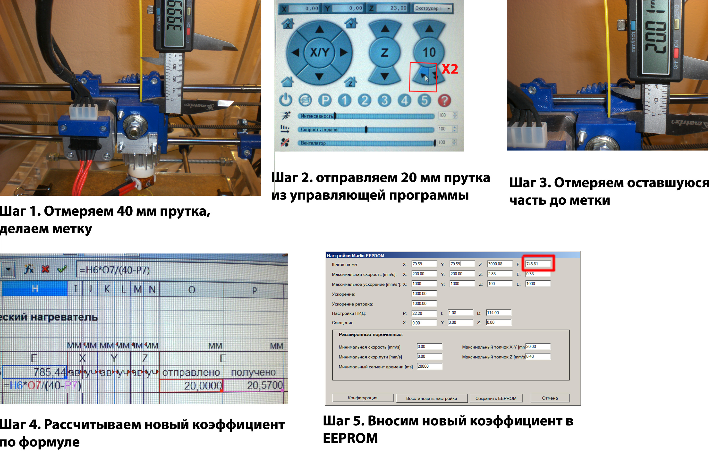 Далее в Repetier-Host в верхнем меню конфигурации выбираем "Конфигурация EEPROM", берем крайнюю справа в верхнем ряду цифру Е и рассчитываем новый коэффициент по формуле: Е новый = Е * 20 / (40 - L)